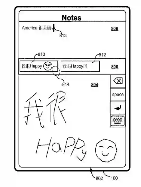 因此,如果实时手写识别技术能够出现在 iOS 设备上,在虚拟键盘输入比较不方便的情况下将会变得相当实用,比如需要快速做笔记或突发灵感的时候。并且可能对国人比较友好的一面是,苹果这项专利描述称,此手写识别技术不仅适用于英语、西班牙语或类似的语言,而且也明确提到了中文手写识别输入的支持。