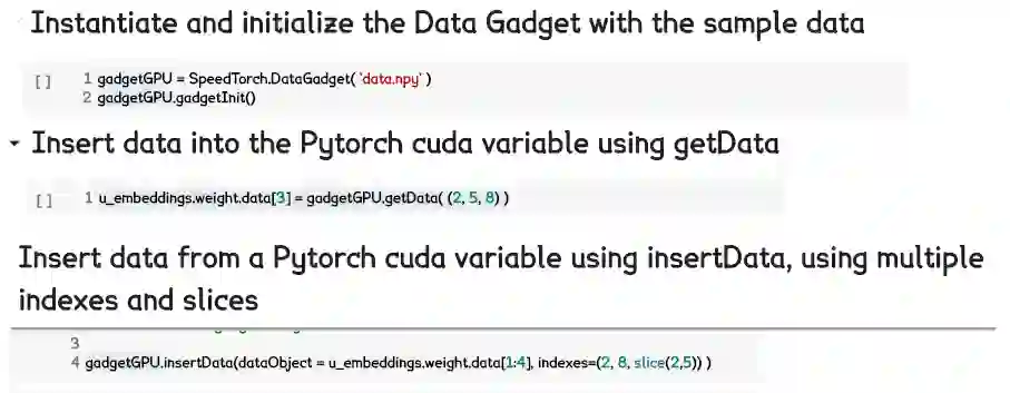 如下 colab notebook 所示,如何利用 Data Gadget 将数据载入 SpeedTorch,以及如何将数据移入/移出 Pytorch cuda 变量。