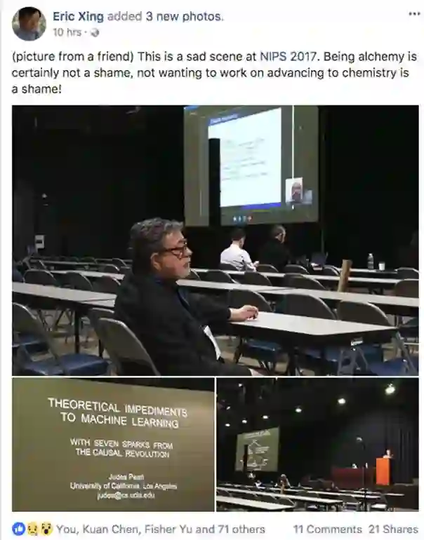 【新智元导读】今天带来一个落寞的背影。最近NIPS 2017 "Test of Time"论文大奖获得者Ali Rahimi 在长滩现场的演讲中把机器学习称为“炼金术”(Alchemy)引起机器学习界的大讨论,不难理解深度学习理论的研究似乎真的陷入了尴尬的境地。与此同时,寂寞的背影,听者寥寥的会场,图灵奖得主同时也是贝叶斯之父 Judea Pearl 的报告似乎并没多少人关心。而报告的题目《机器学习的理论障碍》(Theoretical impediments to machine learning)正是关于Judea Pearl对机器学习特别是深度学习背后理论的思考。
