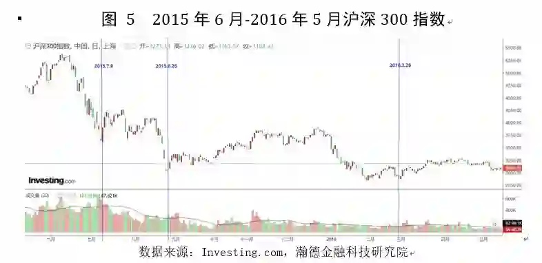 2015年政策发布后股市仍持续震荡下跌,下跌趋势持续半年之久(如图5所示)。我们清楚2015股市大崩盘的原因来自高杠杆的场外配资,涉及信托、银行、基金、证券公司等金融机构,由于受到证监会的约束和监督极少,通过场外配资大规模资金进入股市,托高股价。而股市的快速上涨背后带来的是泡沫的大量累积,在泡沫崩盘后其下跌幅度也越大和创伤修复时间也越长。