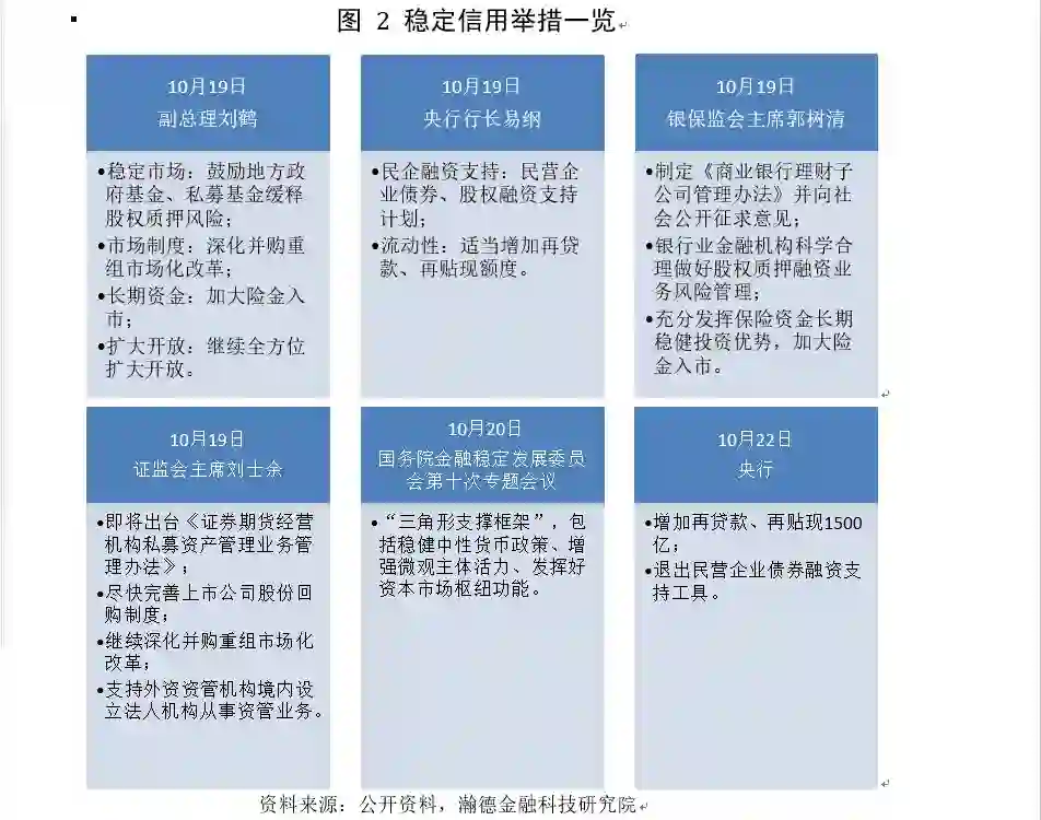 10月19日,副总理刘鹤、央行行长易纲、银保监会主席郭树清、证监会主席刘士余在接受采访时,均对近期股市的大幅波动及未来政策走向有具体回应。监管层、决策层声明的核心主题是“稳信用”(如图2所示),即减小民营企业大面积资金断裂的系统性风险,并且继续深化资本市场改革。