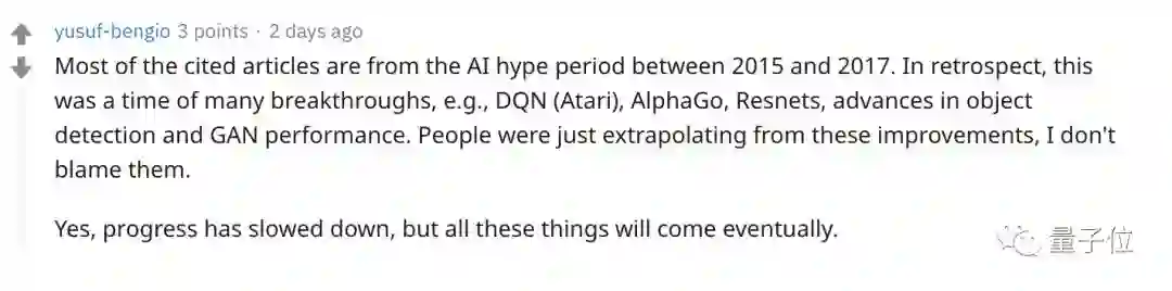 文章里援引的例子大多来自2015到2017年的AI炒作期。回溯来看,那是一个有很多突破的时期,比如DQN,AlphaGo,Resnets,有很多目标检测和GAN执行上的突破。人们刚开始基于这些进展进行推断,我不怪他们。