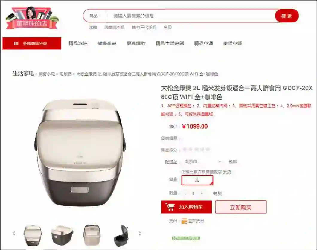 观察者网发现,格力商场中这款产品的品名中标注着“大松金康煲 2L 糙米发芽饭适合三高人群食用”。但在下面的商品介绍中,没有任何关于适合三高人群食用的内容。