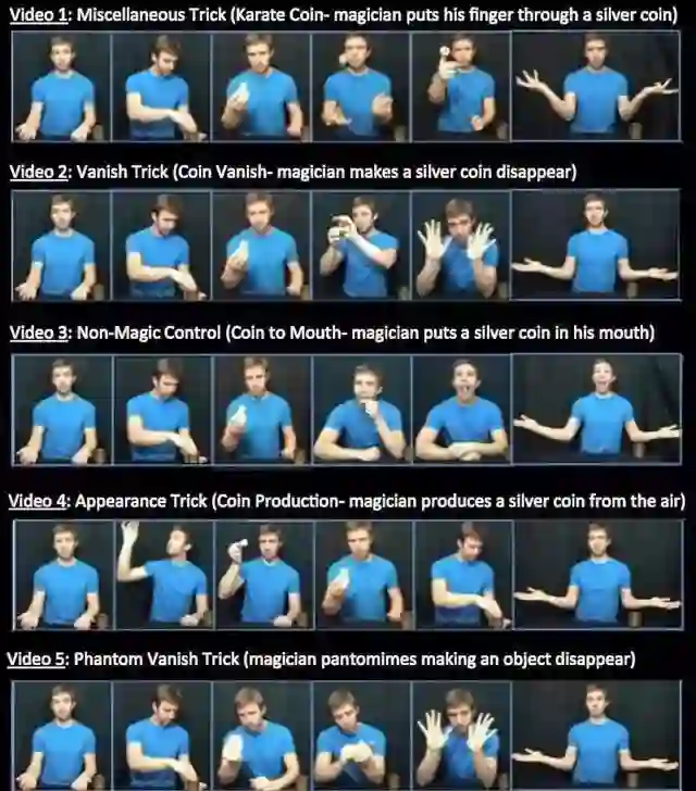 在五段视频中,其实只有第一、二、四段是真正的魔术表演,戏法包括让物体凭空消失或变出,改变物体颜色,手指穿刺硬物等。第三段视频中没有展示任何魔术手法,片中人只是将普通的物体放进嘴里。而在最后一段视频中,魔术师煞有介事地做完了整套“物体凭空消失”的魔术手法,但事实上,他手里根本没有任何东西。为了排除魔术道具自身的干扰,实验者共准备了五套不同的魔术道具,随机分配一套给被试观看。魔术道具分别为硬币、小球、筹码、手帕、以及蜡笔。