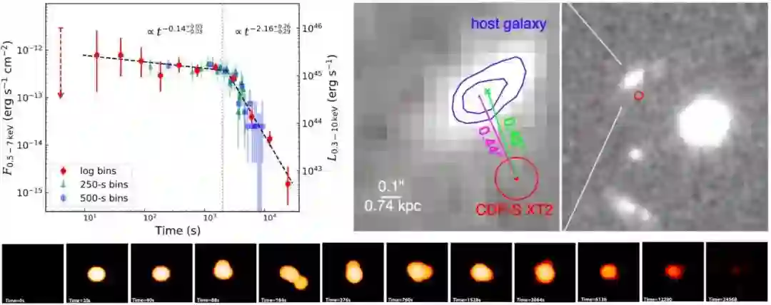 图2:XT2的X射线特征光变曲线(左上)与图像(下)及其相对寄主星系的位置(右上)