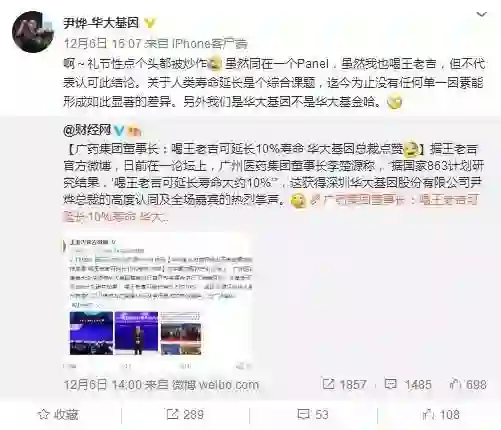 广药集团宣布“喝王老吉可延长寿命大约10%”后,立刻引发热议,有媒体质疑相关实验数据和论证过程。此外,王老吉官微消息称,华大基因CEO尹烨也在现场,并对此“高度认同”。不过,尹烨今日发布微博否认此事,他称,“礼节性点头都被炒作。虽然同在一个Panel,也喝王老吉,但不代表认可此结论。关于人类寿命延长是综合课题,迄今为止没有任何单一因素能形成如此显著的异。”