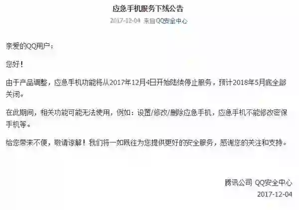 日前,QQ安全中心发布公告称,宣布应急手机服务下线。公告指出,由于产品调整,应急手机功能将从2017年12月4日开始陆续停止服务,预计2018年5月底全部关闭。在此期间,相关功能可能无法使用,例如:设置/修改/删除应急手机,应急手机不能修改密保手机等。