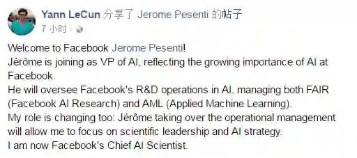 人工智能领域的重量级人物 LeCun 宣布最新动态,他在 Facebook 帐号上宣布,他已经卸任 Facebook 人工智能研究院(FAIR)院长一职,并转为担任首席 AI 科学家,专心从事研究工作,并欢迎 Jérôme Pesenti 加入,将同时统管旗下 AI 两大研究单位:FAIR 以及应用机器学习部门(AML,Applied Machine Learning)。而 Jérôme Pesenti 曾任英国医疗保健 AI 创业公司 BenevolentTech CEO、IBM 大数据部门 CTO。