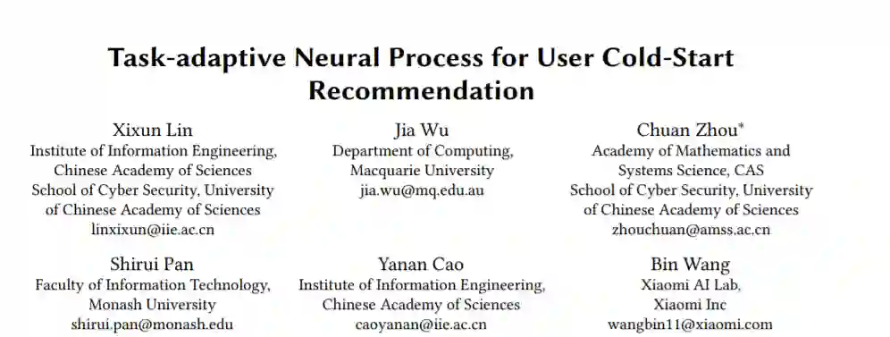 本文提出了一种新的元学习推荐方法——任务自适应神经过程(TaNP)。TaNP是神经过程家族中的一个新成员,为每个用户作出推荐都与相应的随机过程相关联。TaNP直接将每个用户观察到的交互作用映射到一个预测分布,避开了基于梯度的元学习模型中的一些训练问题。更重要的是,为了平衡模型容量和适应可靠性之间的平衡,我们引入了一种新的任务适应机制。它使我们的模型能够学习不同任务的相关性,并自定义全局知识到与任务相关的解码器参数,以估计用户的偏好。在不同的实验设置下,我们在多个基准数据集上验证了TaNP。实证结果表明,TaNP对几个最先进的元学习推荐器产生了一致的改进。