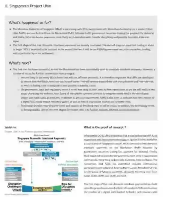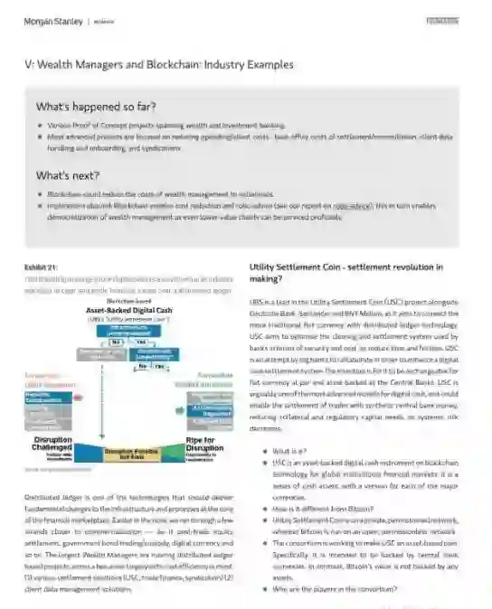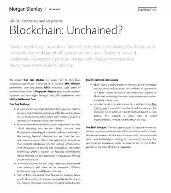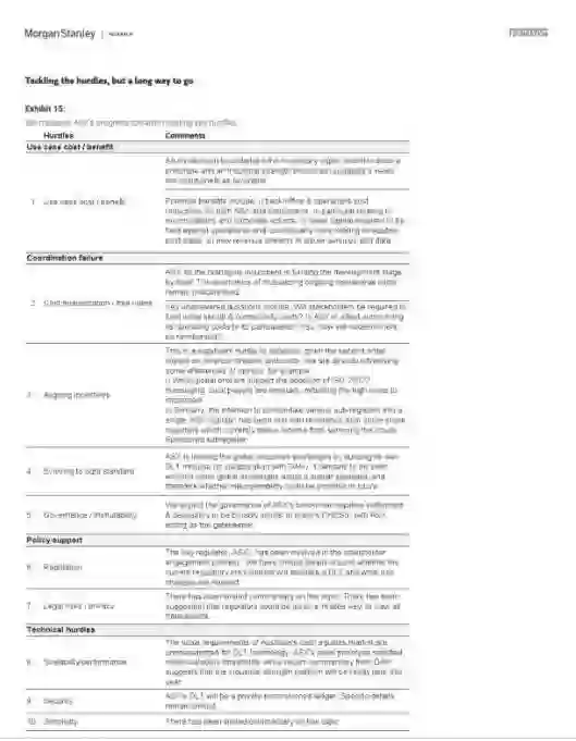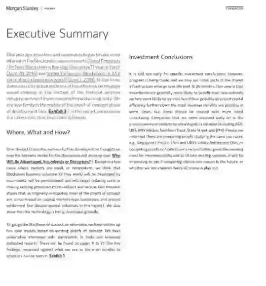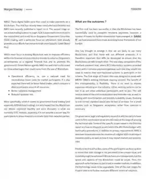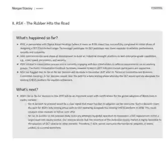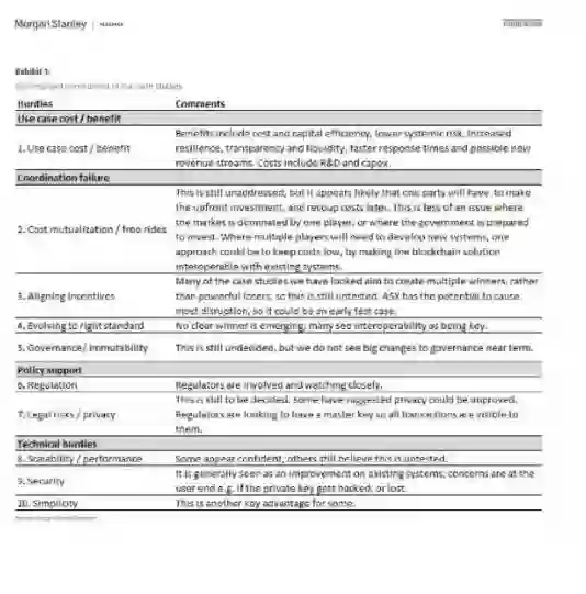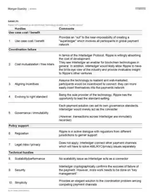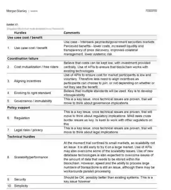 摩根士丹利分析了五个案例以评估区块链发展趋势,这五个案例包括,纽约梅隆银行的政府债券结算、澳交所的行业规模证明概念、新加坡的Ubin项目、Ripple的跨境支付解决方案和跨帐本协议,以及瑞银与Utility Settlement Coin的合作实验。