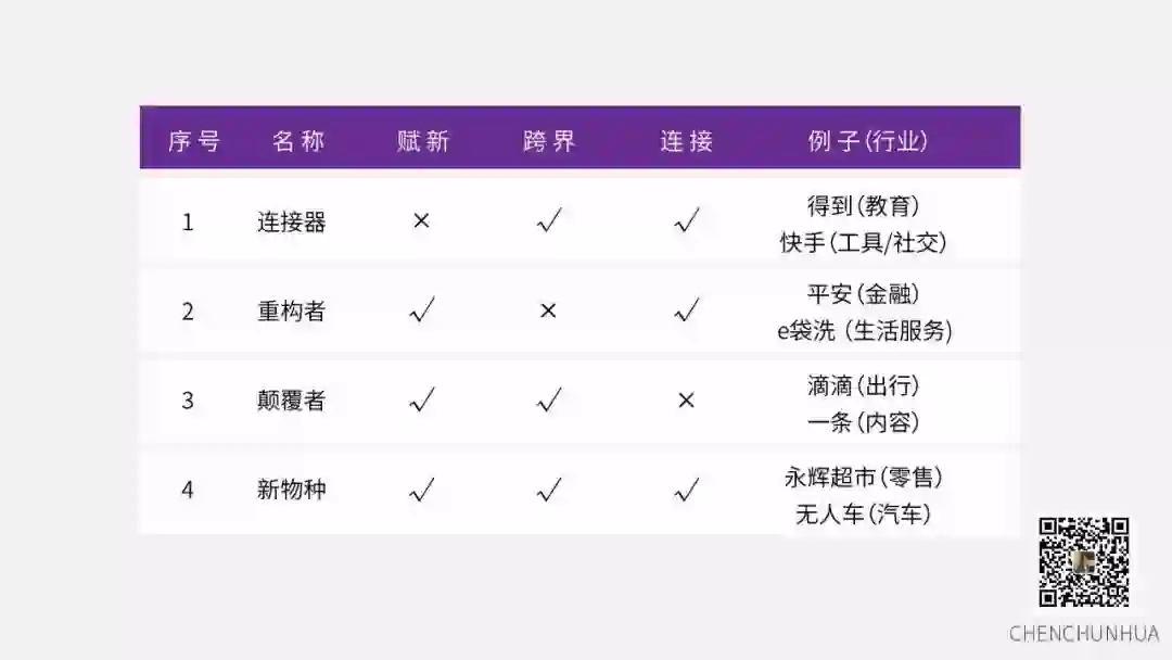 3.颠覆者。第三种组合是同时在「赋新」和「跨界」上突破,但不连接原有系统之外的其他资源或要素。由于是跨界,对原有行业的在位企业来说面临的是非对称竞争,行业的游戏规则可能也会改变,因此这种组合被称为「颠覆者」。