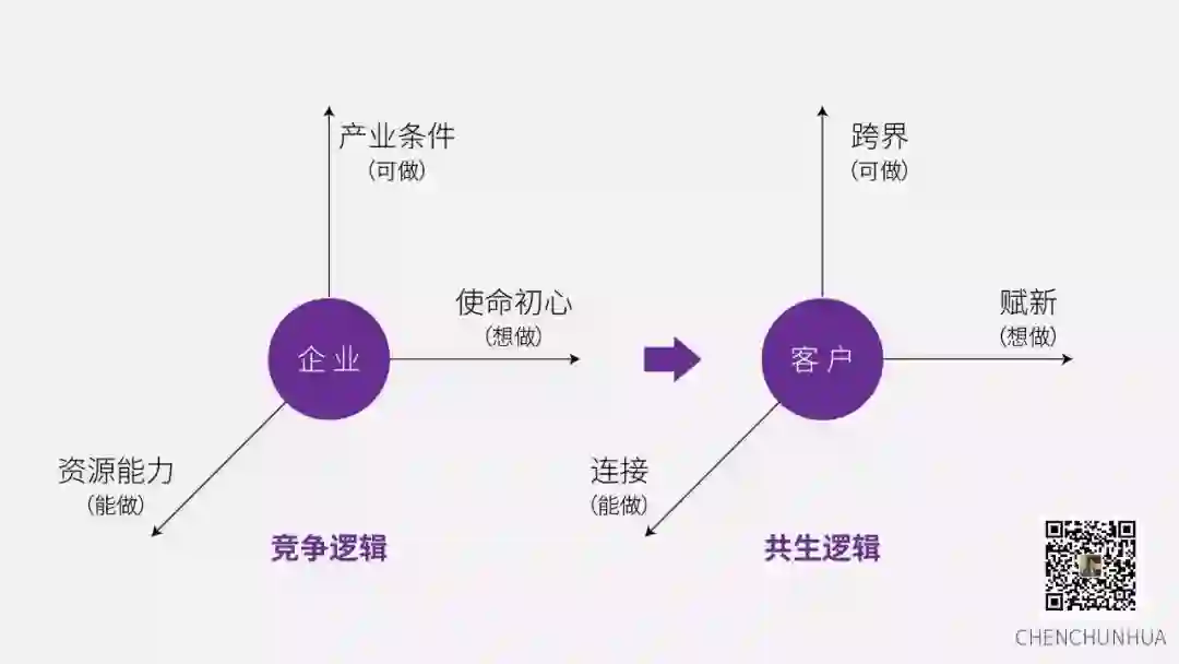 导读:工业时代是竞争逻辑,而数字时代是共生逻辑。企业向数字时代转型,需要更新认知框架,沿着「可做」「能做」「想做」这三个维度进行突破,实现「跨界(突破产业条件)、连接(突破资源能力)、赋新(突破优势选择)」的组合。