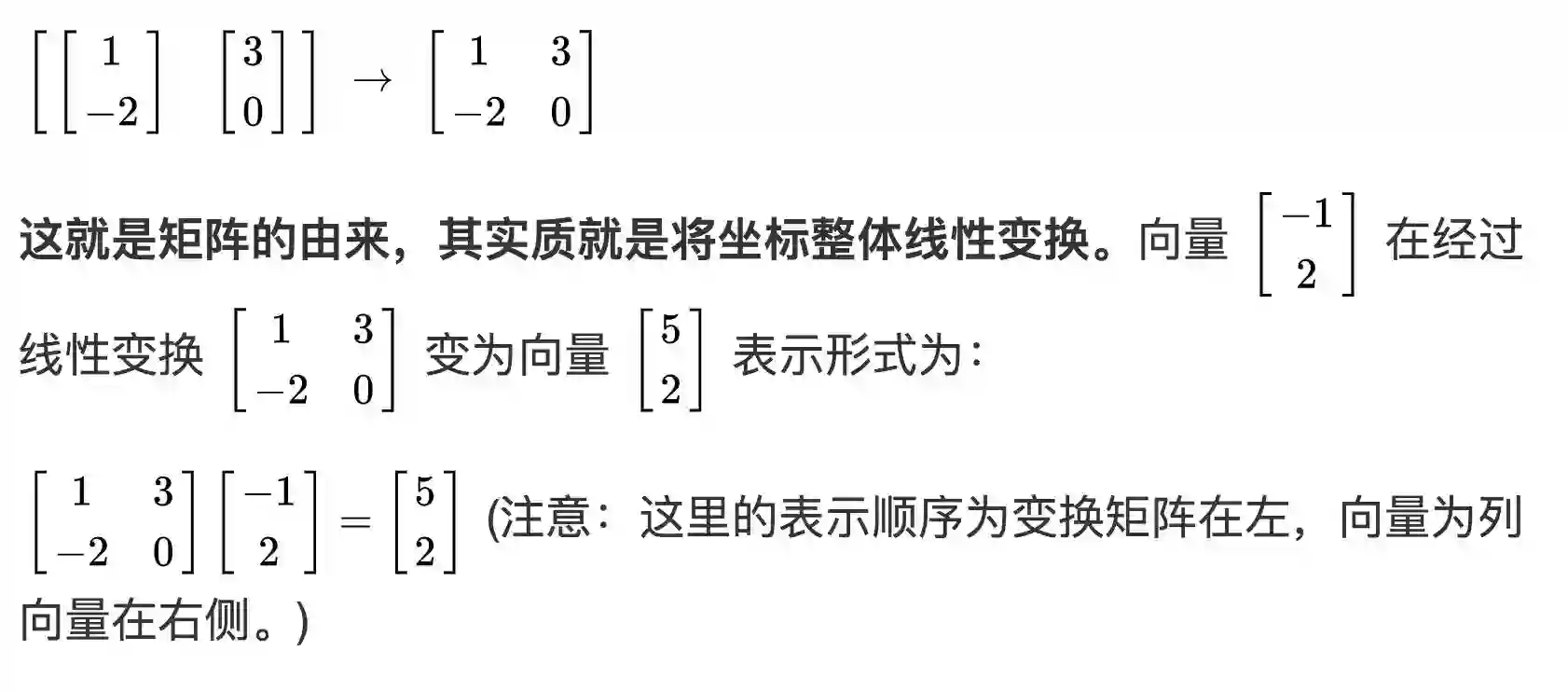 矩阵乘法我更喜欢称作线性转换。一个矩阵乘以向量中,矩阵相当于一个转换函数,而向量是一个输入,已知了输入和函数,我们就可以知道输出。这里需要强调的是,向量共有两种形式,一种为列向量,一种为行向量。在默认情况下,向量是指列向量。大部分的国内教材中,并没有特意提到这一点。很多人接触到编写代码时,都是以行向量的形式开始学习,导致后续有很多概念产生混淆。在本文中,若无特殊说明,向量的形式默认为列向量。
