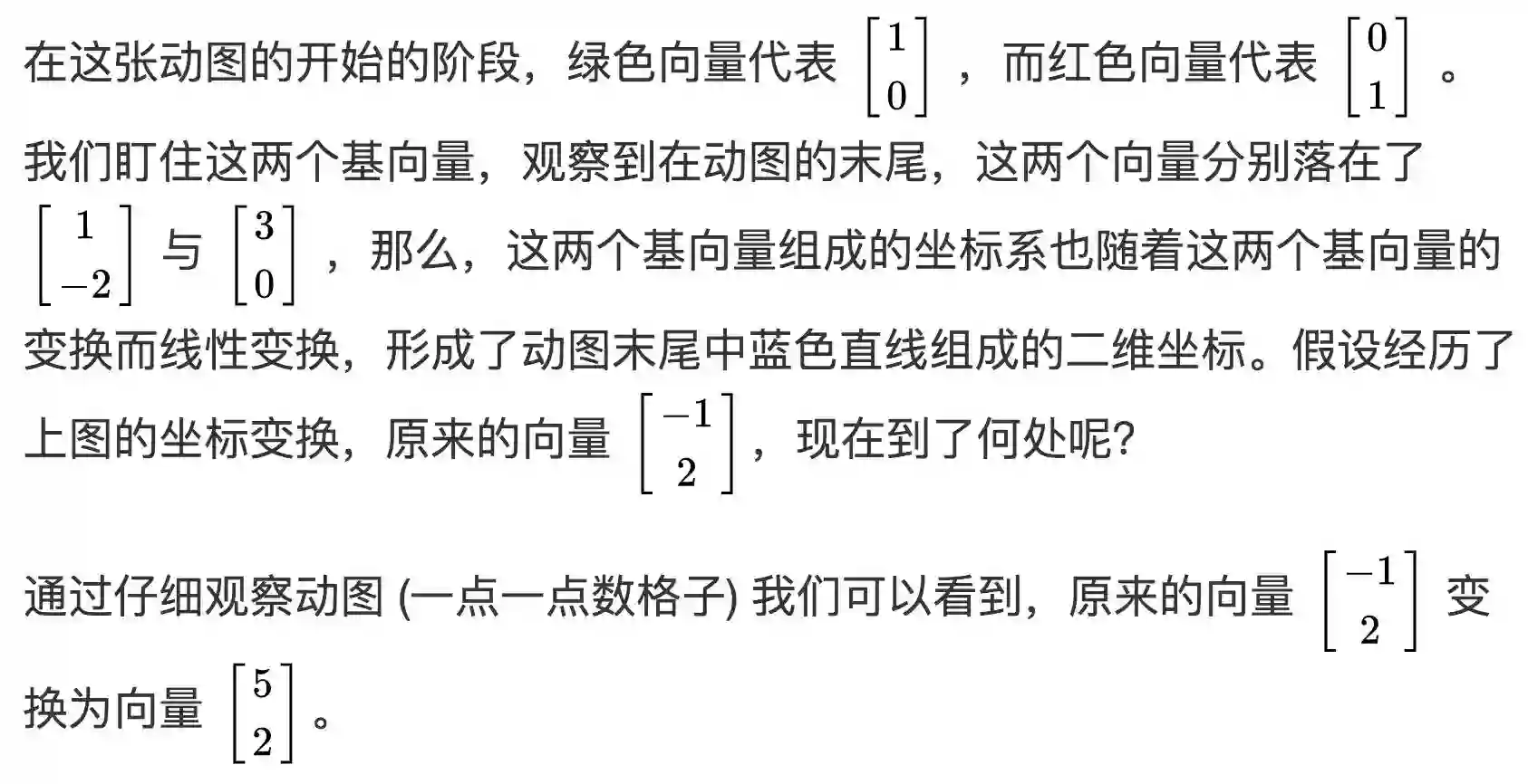 这其中的区别就是基向量不一样了,而线性组合的系数 -1 与 2 保持固定不变。