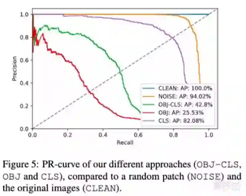 最终,研究人员将获得的几个补丁和NOISE(随机添加噪声)、CLEAN(无补丁baseline)一起放在Inria测试集上做评估,重点评估这些补丁能避开多少监控系统产生的警报。