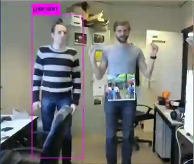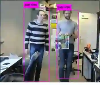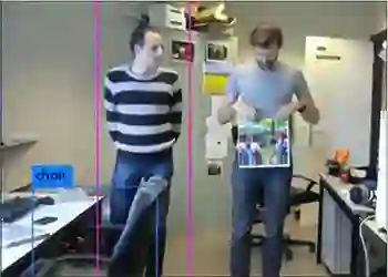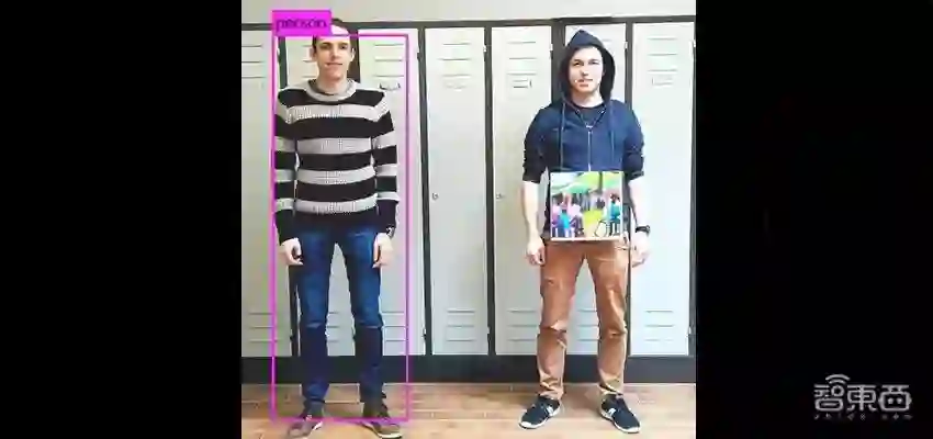 如图,右边的人身上挂了一块彩色贴纸,这张贴纸成功欺骗了AI系统,使他即便正面摄像头,也没有像左边的人那样被AI系统检测出来(粉色框)。