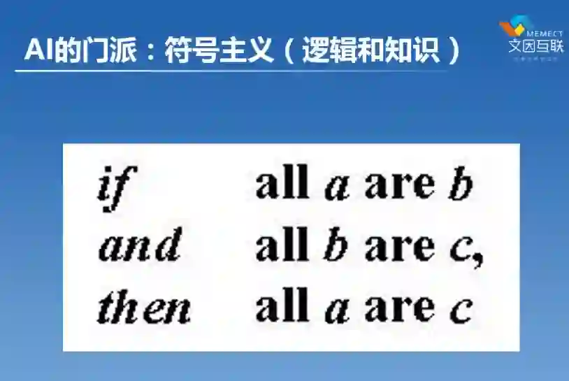 第三个门派叫做符号主义,有人也叫它理性主义。在不同的历史时期,我们叫它不同的说法。在四十年代、五十年代我们叫它逻辑,后来我们叫它知识,再后来叫它语义网,这两年叫它知识图谱。其实它都是一个门派传下来的东西,实际就是逻辑推理:如果鸡是一种鸟,鸟是一种动物,那鸡就是一种动物。就是这种大前提、小前提、结论,三段论。