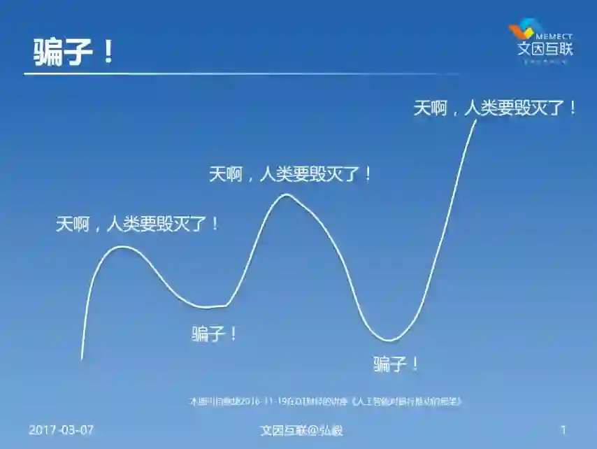 下面这个图是我在三个月之前在DT财经的讲座里面画的。这个图差不多就是过去30年来,我们整个领域的血泪史吧。媒体一会儿说你们这一群人要毁灭人类了,然后又过了十年说你们是一群骗子。我最早接触人工智能到今年已经20年时间,经历了两个轮回,被鄙视了两次。