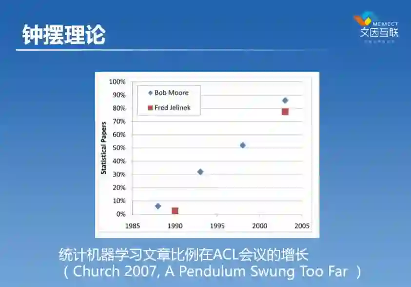 这一幅图是我们领域里一个元老叫Church这个教授,他在2007年的一篇文章里面给出的。他统计了机器学习这种方法在ACL这个会议里面的比例(ACL就是美国计算语言协会的年会,这是这个领域里非常重要的一个学术会议)。我们可以看到,从80年代末到2005年这期间,整个统计的方法的比例是在不断提高的,从不到10%提高到接近90%,也代表了整个领域,在钟摆的这一摆大概花了差不多十几年的时间摆过来了。