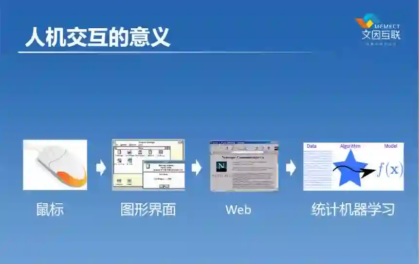 刚才提到了互联网带来的数据是为什么机器学习兴起的原因。我们深入去想一想,再前面的那些原因是什么?我们可以追溯到鼠标的发明者,这是一个很长的链条了。我们有了鼠标,我们才有了图形用户界画,我们有了图形用户界画,我们才会有了Web,你能想象一个没有图形用户界面的浏览器是什么样子吗?这东西是存在的,真的是存在的。比DOS还要再老,这样一种东西,会让普通的千家万户的人去用吗?不可能。正是有了前面人机交互的进步,所以我们才会有了千家万户的,每个人都会用的互联网,所以才会有了数据,所以统计机器学习才成为可能。
