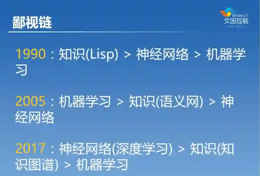 知识这个领域,也在十年的消沉之中恢复起来了,摇身一变换了一个名字叫知识图谱。2012年前后几个大的公司,把这个东西带起来,现在反而是机器学习,在整个鄙视链里面往下降。这就是咱们的钟摆,就是人工智能整个领域是起起伏伏的,人工智能里面每个学派本身也是起起伏伏的。