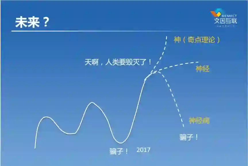 这三个可能性,我觉得具体到哪一种,不取决于人工智能这个领域的研究者本身,可能更多取决于像我和各位这样的互动。如果大家觉得人工智能会是第一种结局的话,那么最终就有可能是最后一种结局,这是“双输”的结局。如果大家觉得人工智能无所不能,大家就会发现我们是骗子。如果一个行业,大家能够真正理性地去看它,我更认为中间那个所谓的“神经”会是我们的结局,这一种结局是对大家最有利的,让这个领域坚定地往前走,然后一点一点地往前推进。