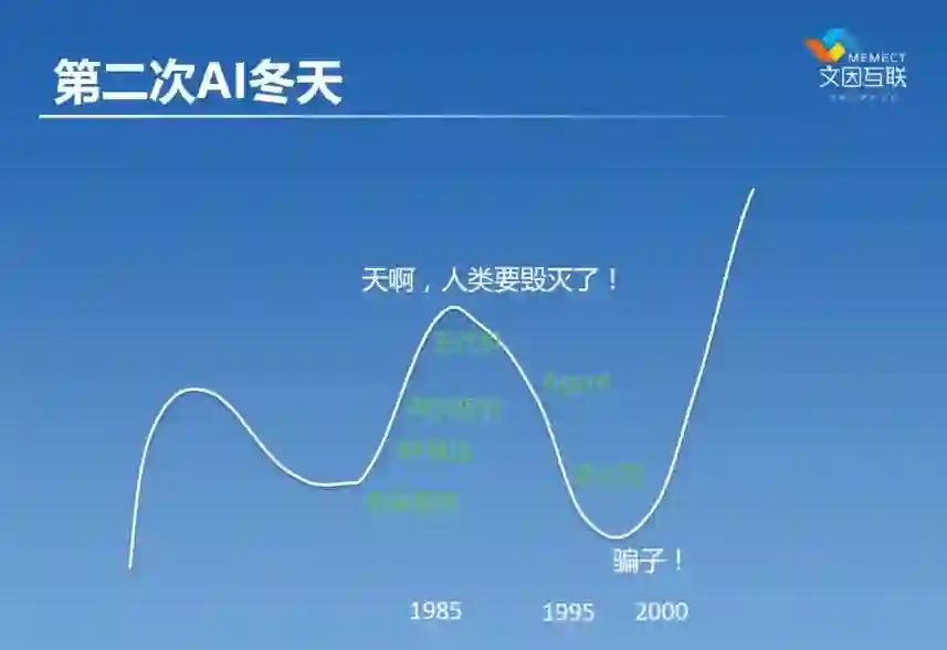 在90年代的时候,那时候最牛逼的是知识,那时候有一个语言叫Lisp语言,在美国至少有200个公司在做Lisp的应用研究,就好像现在深度学习的研究一样。日本在那个时候,他们投了上千亿日元去开发这个五代机,因为他们相信这个东西是未来。那个时候神经网络还可以,其实神经网络最高峰的时候应该是80年代末的时候。机器学习当时是最Low的,大家看不起机器学习。