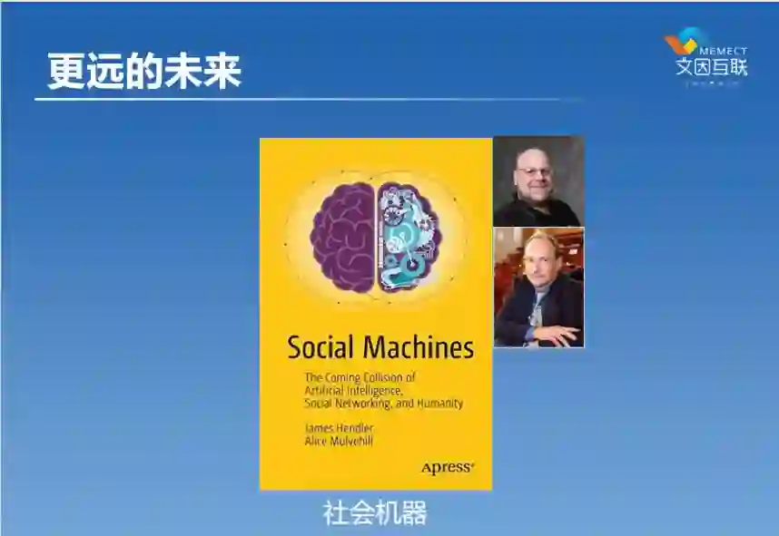 我不太相信这个观点,在我看来,我还是跳到《社会机器》这本书讲吧。我比较信奉“社会机器”这个理论,当然我是有偏爱的,为什么我相信这个理论?因为这两位老先生是我的导师,所以我是他们这个学派。上面这个先生叫James Hendler,是我博士后期间的第一位导师,他是语义网的创始人。“社会机器”-Social Machines这个理论是下面这位先生提出的,他叫 Tim Berners-Lee,他是Web的发明人,就是整个万维网的发明人。今天大家每个人每天上网,要感谢他在1990年的时候,做出的这个发明。Tim Berners-Lee,在我看来,是当代对人类的历史进程有最大的影响力的人之一,真正的哲学家,真正的思想家。在1999年的时候,他写了一本书,在这里面提出来了“社会机器”这个概念,就是说我们人类组织在一起变成了一个社会,以后社会的成员不仅仅是咱们人类,还会有机器。我们大家为什么天天没事就在刷手机?因为现在机器真的变成我们不可分割的一部分了,所以说整个社会不仅仅是由人类组成的,越来越多的机器也会参与进来,作为我们人类和人类之间的媒介也好、中介也好。