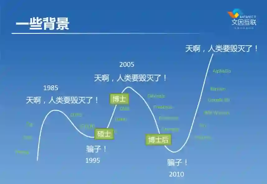 把刚才讲的这些事情映射到一开始看到的那个图上去,我在做硕士的期间就相当于人工智能第一个冬天正在走出去回暖的那个时候,所以我的硕士读得也很开心的。到了开始读博士的时候刚刚好,到了又一个顶点然后往下来,整个博士期间AI就是在往下走。到博士后毕业的时候又是一个冬天,在那个时候一起毕业的那一帮同学基本上都转行了,只有我一个人很坚持。我觉得这些事总是有价值的,所以一直坚持。后来坚持到了2010年前后,这事情开始往回转。到了现在大家开始说了,你们又要消灭人类了,所以这就是很常见的大家对人工智能两个误解,一是你们要消灭人类,然后过十年说你们是一群骗子。