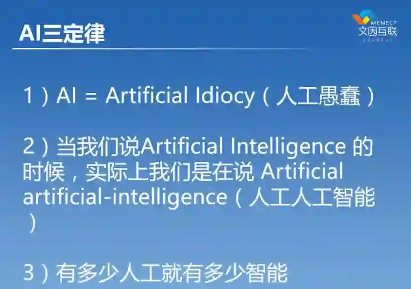 第一个定律是说 AI 不是 Artificial Intelligence,是 Artificial Idiocy。还有人说是动物智能(Animal Intelligence),我觉得这是比较靠谱的一个说法,就是现在我们所谓的人工智能,我们看到AlphaGo 这些东西,其实它都是很机械的一种,它只是速度很快,我觉得它的智能水准基本上就相当于一个蟑螂。我觉得能到蟑螂就算还不错了,然而它并没有真正达到人的智能,其实连高等动物的智能都达不到。