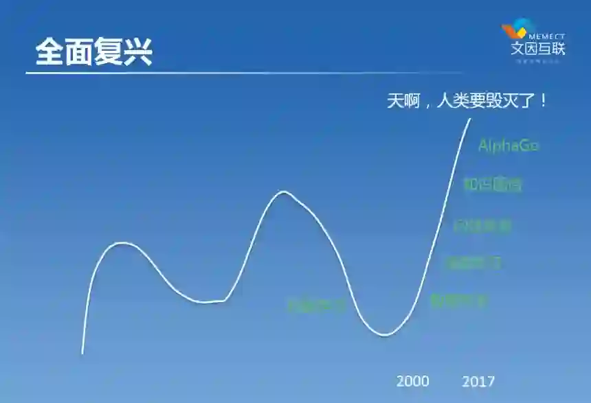 经过了差不多十几年不懈的努力,人工智能整个领域里又从低谷里跳出来了。尤其是在90年代的时候,互联网可以说改变了一切,互联网改变了人工智能。在有互联网之前,很多年的时候已经有了所谓的机器学习的算法了,但是机器学习一直都没有起来,90年代反而起来了,大家知道为什么呢?因为数据量大了。有了互联网,我们第一次有了非常廉价地获取数据的这种方式。