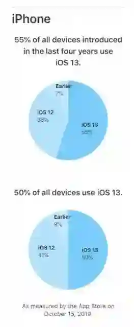 目前所有iPhone和iPod touch设备中有50%运行iOS 13,有33%的iPad运行iPadOS。