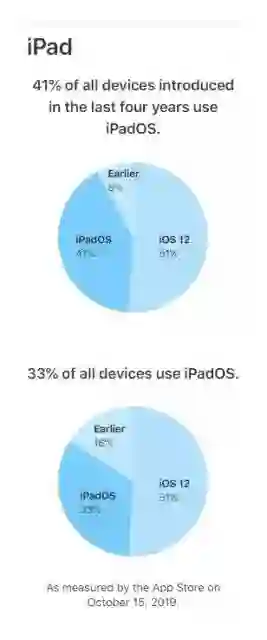 在iPad方面,最近四年推出的所有iPad设备中,有41%在运行iPadOS 13,有51%在运行iOS 13,还有有13%在运行iOS的早期版本。