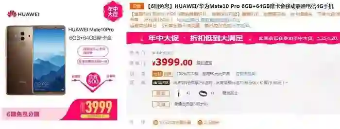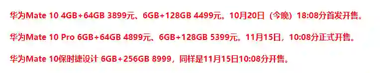 价格上,华为Mate10 Pro 6GB+64GB版本的起售价为4899元。