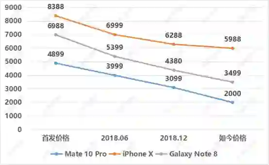 如今华为Mate10 Pro的新机已经很少了,都是些第三方的店铺在售卖,售价大约2000元,跌幅60%。Note8跌幅大约50%,同期的iPhoneX跌幅大约28.7%。