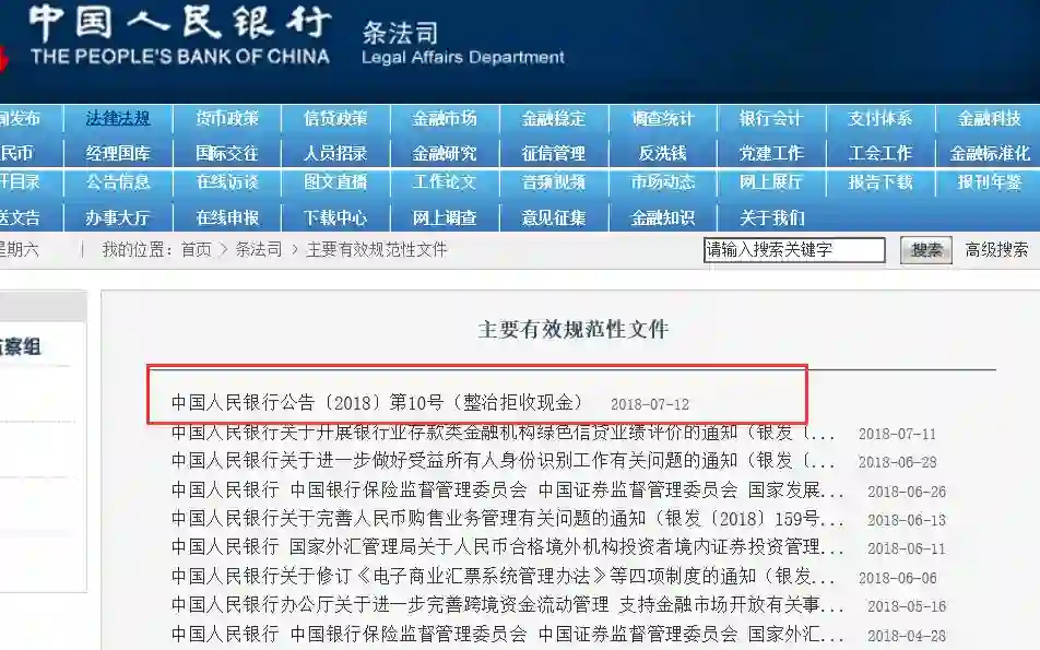 去年7月13日,央行发布公告(中国人民银行公告〔2018〕第10号)指出,中华人民共和国的法定货币是人民币,包括纸币和硬币(以下统称现金)。