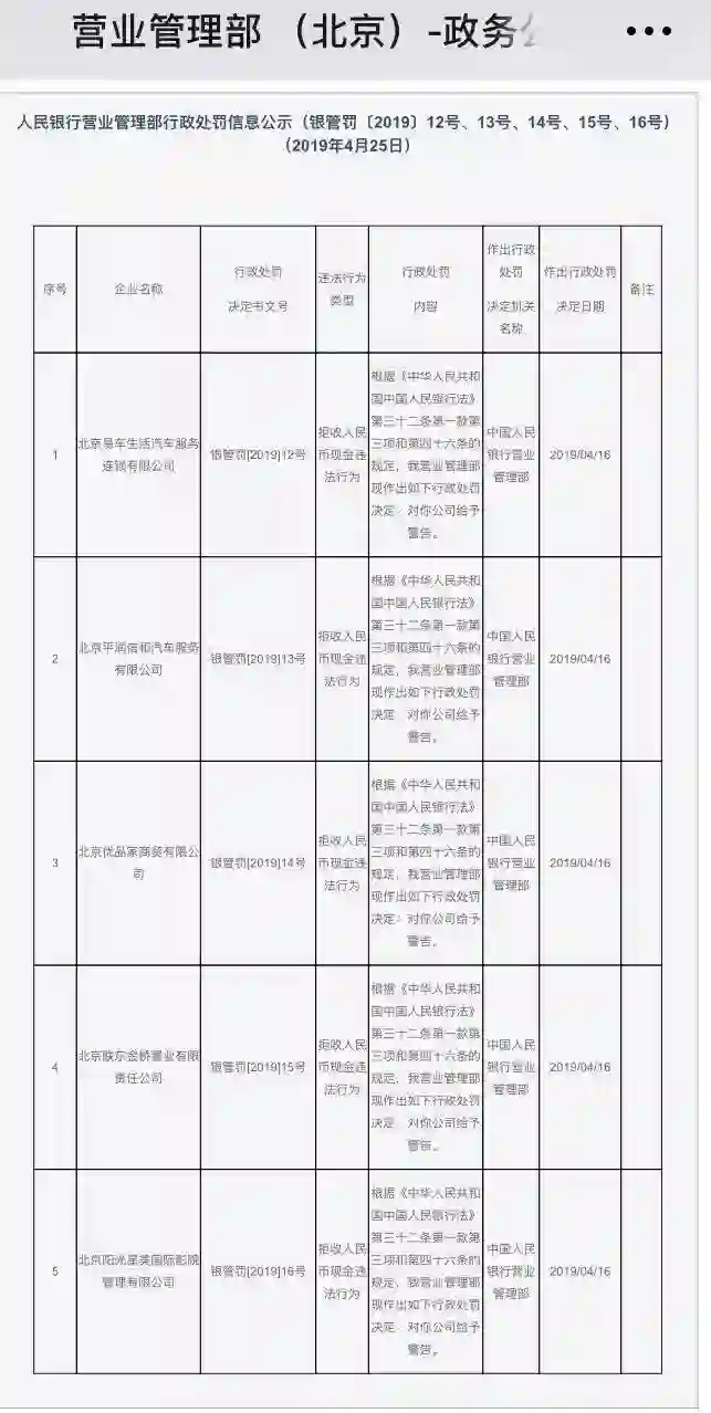 具体来看,根据银管罚〔2019〕12号、13号、14号、15号、16号文件显示,北京易车生活汽车服务连锁有限公司、北京平润信和汽车服务有限公司、北京优品家商贸有限公司、北京联东金桥置业有限责任公司、北京阳光星美国际影院管理有限公司存在拒收人民币现金违法行为。