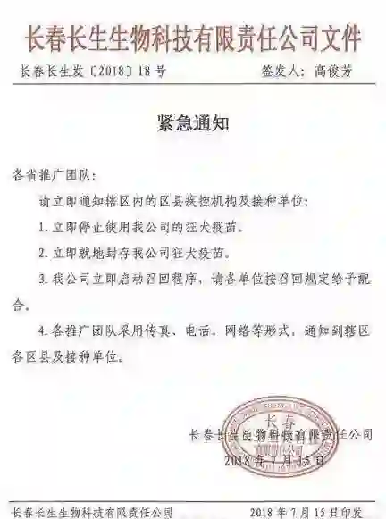 很快,长生生物被公众“狂犬病疫苗生产信息造假”、“赚着人民的钱,却把百姓生命当儿戏”等舆论包围。当天,高俊芳向推广团队签署紧急通知“立即停止使用我公司的狂犬疫苗;立即就地封存我公司狂犬疫苗”。