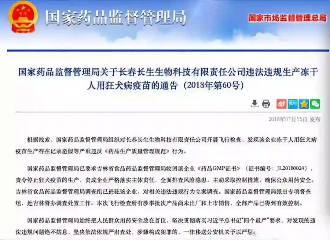 7月15日,国家药监局“重拳出击”的拳头落在长生生物头上。其通报长生生物违法违规生产冻干人用狂犬病疫苗。