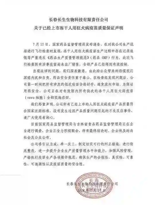 17日,长春长生生物在官网发布声明道歉,“此次飞行检查所有涉事疫苗尚未出厂销售,全部产品已经得到有效控制”,“在此期间,已上市狂犬疫苗符合标准,请放心”。