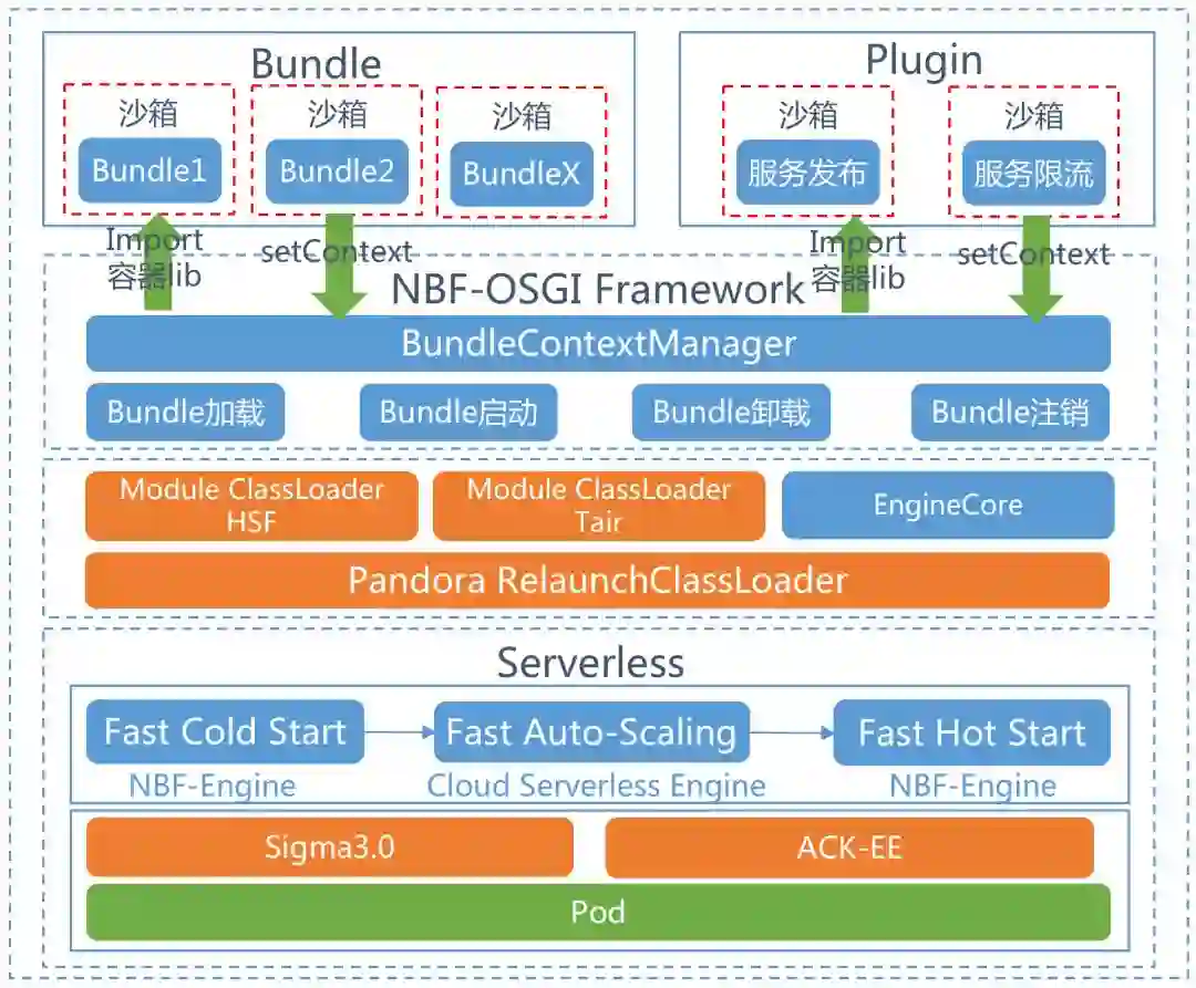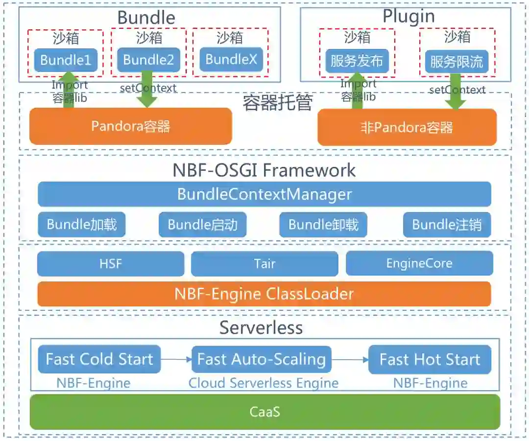 b. Bundle隔离:NBF容器会为每个Bundle建立独立沙箱,从加载机制上保证了Bundle代码级别隔离,避免Bundle之间的类和资源冲突。