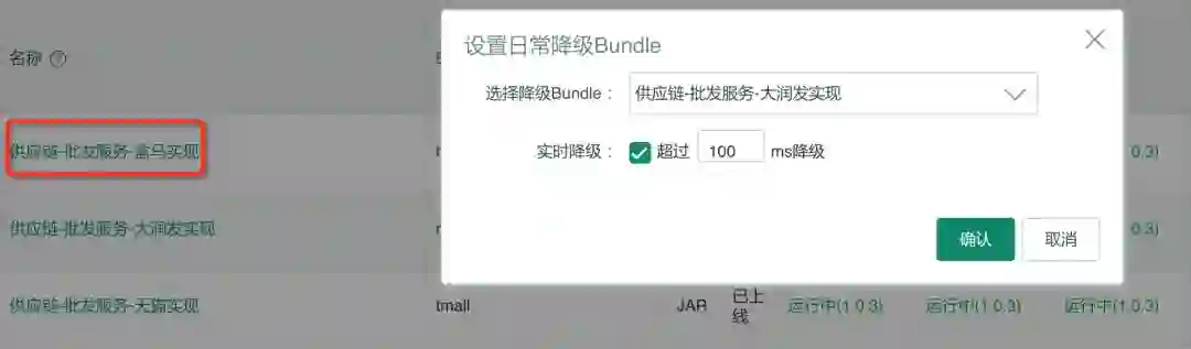 流量管控提供了一种软负载的能力,支持设置Bundle和降级Bundle之间的流量配比,我们仍以Bundle:供应链-批发服务-盒马实现为例,以图为证:
