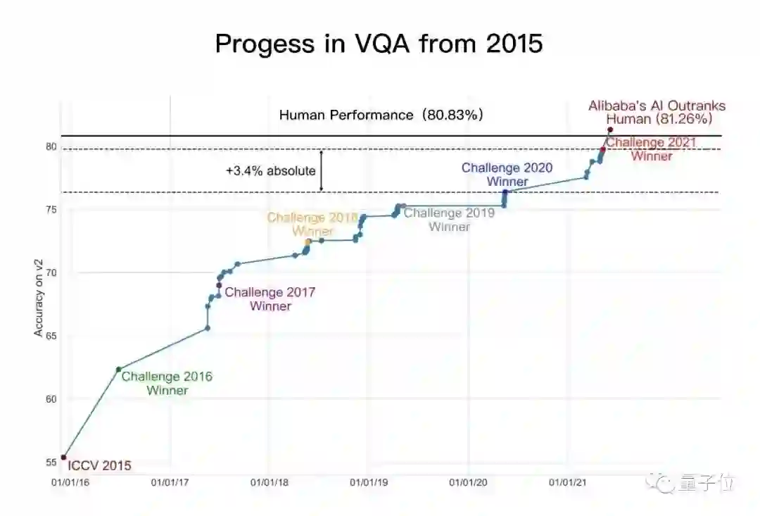 比如VQA challenge第一,准确率首超人类表现: