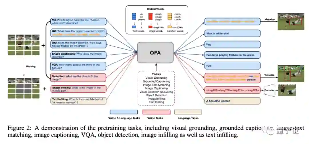 而OFA考虑的是另一种思路——Task Scaling First,任务规模优先。让单一模型能做尽可能多的跨模态任务,这样预训练后不新增结构,就能直接在下游任务中使用。