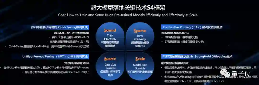 例如达摩院推出的大模型落地技术S4(Sound、Sparse、Scarce、Scale)框架,就包含了各种微调算法和模型压缩算法,本质上是希望将稀疏化等技术应用到到百亿量级的大模型中。