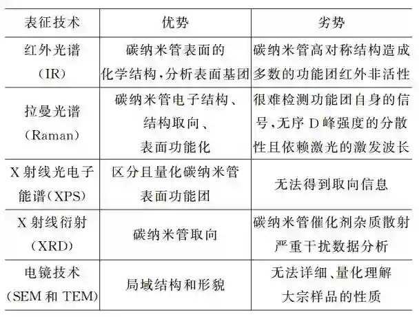 表1 与同步辐射表征技术比较,常规表征技术在碳纳米管结构与性能表征中的特点与不足