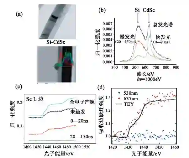 图5 (a) 一 维 Si-CdSe纳米异质结构的电镜照 片;(b) 一维Si-CdSe纳米异质结构的时间分辨 XEOL 谱图;(c)SeL 边的XANES:不同时间窗口的PLY和 TEY比较的 XEOL谱图;(d)SeL边的 XANES:不同波长段的PLY与 TEY比较的 XEOL谱图