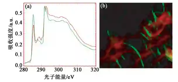 图3 利用STXM 对碳纳米管的成像(b)与相对应的吸收谱(a)(其中红色代表氧化后的碳纳米管,绿色代表未氧化的碳纳米管. 图中碳纳米管束直径尺寸约为100nm)