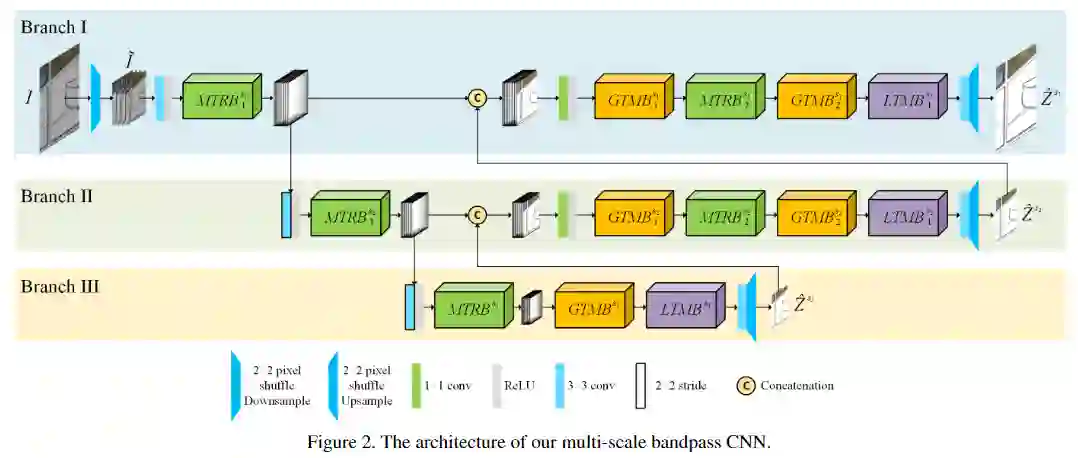 整体的模型在三个scales上工作,并具有三种不同类型的blocks,分别是波纹纹理去除块(MTRB),全局色调映射块(GTMB)和局部色调映射块(LTMB)。