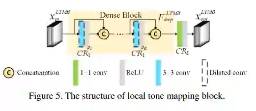 RGB颜色空间是一个非常大的空间,包含256的3次方种颜色,因此很难进行逐点色调映射。观察到摩尔纹图像和干净图像之间存在颜色偏移,本文提出了一种两步色调映射策略,其中包含两种类型的色调映射块:全局色调映射块(GTMB)和局部色调映射块(LTMB)。